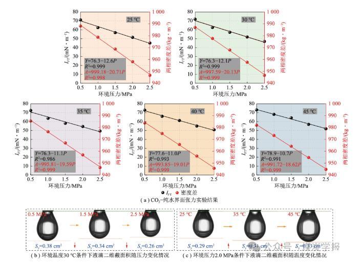 圖 2 不同溫度、壓力條件下 CO2?純水界面張力變化情況