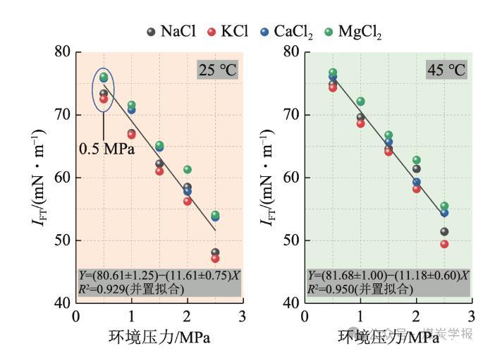圖 4 不同離子溶液類型條件下 CO2?純水界面張力變化情況(礦化度統一為 1.5%)