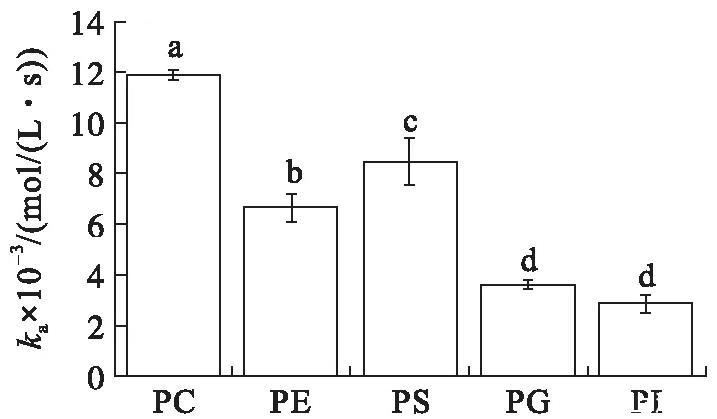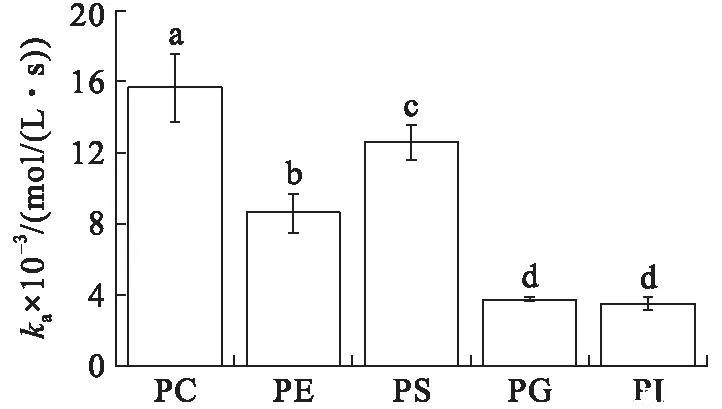 相比于15 mN/m的初始表面壓力條件,VhPLD在20 mN/m和25 mN/m條件下對PC、PE和PS的吸附常數均顯著高于15 mN/m條件下相應的ka值(P<0.05),VhPLD在20 mN/m和25 mN/m條件下ka之間卻沒有顯著性差異(P>0.05)。而對于PG而言,不同初始表面壓力條件下ka之間沒有顯著性差異(P>0.05)。相反的,VhPLD在25 mN/m條件下PI的ka與在15 mN/m和20 mN/m條件下均有顯著性差異(P<0.05)。
