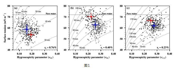 大氣氣溶膠作為云凝結核,通過與云的相互作用對氣候產生影響。氣溶膠活化為云滴,除了取決于氣溶膠的粒徑大小、化學成分和混合狀態,更進一步地,與氣溶膠的表面張力息息相關。大氣氣溶膠和云滴中廣泛存在著具有表面活性的有機物,它們可以減小氣溶膠活化時的表面張力,降低粒子增長的能量壁壘,使氣溶膠更容易被活化為云滴,從而增加云滴數濃度。本次研究結果表明:有機物顯著降低了污染大氣中氣溶膠的表面張力。
