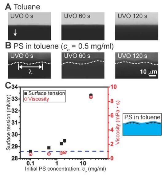 圖 2 (A) 僅通過流涂的甲苯的彎液面前端。 箭頭表示流動后退方向。 (B) 彎月面 聚苯乙烯(PS)在甲苯中通過流涂的前面。 白色的 虛線是眼睛的指南,半月板前面跟隨 k 的周期波長。 (C) 表面張力和粘度作為 初始 PS 濃度的函數(shù)。 藍色虛線表示甲苯的表面張力。 示意圖說明 可能由表面張力梯度引起的流動(由 濃度梯度)用于在彎月面蒸發(fā)前沿的甲苯中的 PS。