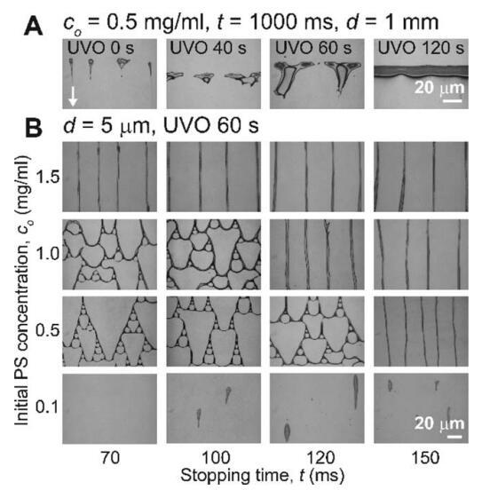 圖 5 (A) PS 圖案作為 UVO 曝光時間的函數(shù) 具有恒定的初始 PS 濃度 (co 5 0.5 mg/mL)、停止時間 (t 5 1000 ms) 和設置距離 (d 5 1 mm)。 這 白色箭頭表示流動后退方向。 (二) 聚苯乙烯 模式作為 co 和 t 的函數(shù),同時保持不變 距離 (d 5 5 lm) 和 60 秒的 UVO 曝光時間。