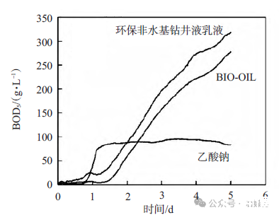 圖1 BIO-OIL、乙酸鈉溶液、環保非水基鉆井液乳液BOD5隨測試時間的變化