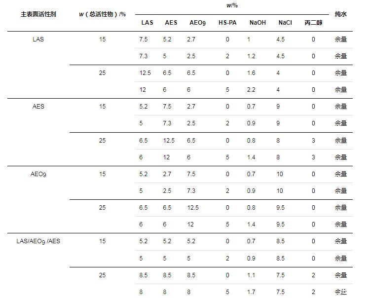 由前文可知,不同表面活性劑在膠束形態(tài)、增稠、去污等多個方面均有不同表現(xiàn)。對于結(jié)構(gòu)型洗滌劑,考察不同主表面活性劑的區(qū)別,同時探究了HS-PA在形成結(jié)構(gòu)型洗滌劑中發(fā)揮的作用。與增稠性能類似,不同配方體系形成結(jié)構(gòu)型洗滌劑所需添加的鹽量也不同。因此,在設(shè)計配方時,只要求同組的實驗樣品(含HS-PA)和空白樣品(不含HS-PA)的鹽量相同(制備樣品時,以鹽量加至空白組出現(xiàn)剪切變稀的現(xiàn)象為準),具體配方如表2所示(表中LAS、AES已換算為純質(zhì)量分數(shù),HS-PA(w=30%)未換算)。