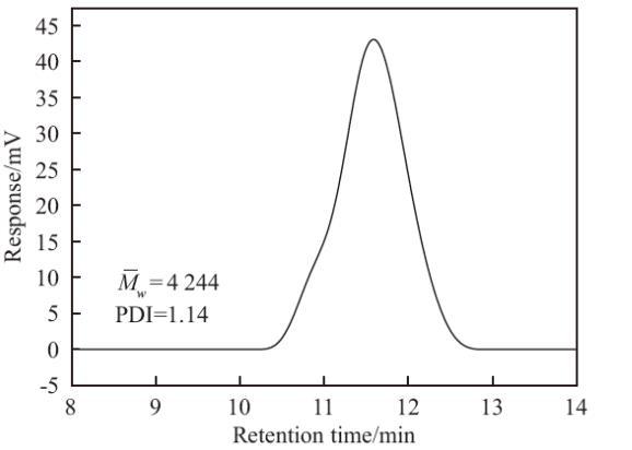 圖1為HS-PA的相對分子量以及分散性指數(shù)PDI。由圖1可知,聚醚-聚丙烯酸/酯高分子表面活性劑的GPC圖呈單峰分布,重均分子量為4 244,PDI為1.14,表明其為均一的聚合物,且分子量分布較為均勻。