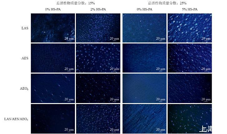圖5為結(jié)構(gòu)型洗滌劑的偏光紋理圖(表2中的配方,以“主表面活性劑—總活性物質(zhì)量分數(shù)—HS-PA質(zhì)量分數(shù)”區(qū)分)。從圖中可以明顯看出,在分別以LAS、AES和AEO9為主表面活性劑的配方中,當(dāng)總活性物質(zhì)量分數(shù)約為15%或者25%時,加入HS-PA后,偏光圖像中的馬耳他十字液晶形狀均明顯增多。馬耳他十字是球形層狀液晶的典型織構(gòu),說明了HS-PA的加入有利于體系形成球形層狀液晶。當(dāng)體系中不含HS-PA時,偏光視野并非完全暗場,而是有微弱的油狀條紋或者少量的馬耳他十字,表明其中也具有部分平面或者球形層狀液晶結(jié)構(gòu),但液晶較弱。不同主表面活性劑的層狀液晶結(jié)構(gòu)存在一些區(qū)別,AEO9為主表面活性劑的配方,其十字花紋理直徑為2~3μm,小于LAS、AES以及三元表面活性劑平衡體系的十字花紋理直徑(7~10μm)。以上結(jié)果與HS-PA復(fù)配體系中的粒徑分布變化相吻合:當(dāng)HS-PA與低分子量表面活性劑復(fù)配時,LAS/AES與HS-PA的混合膠束粒徑明顯變大,但AEO9與HS-PA的混合膠束粒徑只略微變大。根據(jù)球形層狀液晶的結(jié)構(gòu)可知,其內(nèi)部混合膠束粒徑越大,則相應(yīng)的液晶粒徑越大。對于除AEO9外的其他3種體系而言,總活性物質(zhì)量分數(shù)從15%提高到25%,HS-PA加量從2%增加至5%,球形層狀液晶的粒徑會相應(yīng)增大,此現(xiàn)象在LAS為主表面活性劑以及LAS較多的三元表面活性劑平衡體系中更為明顯。
