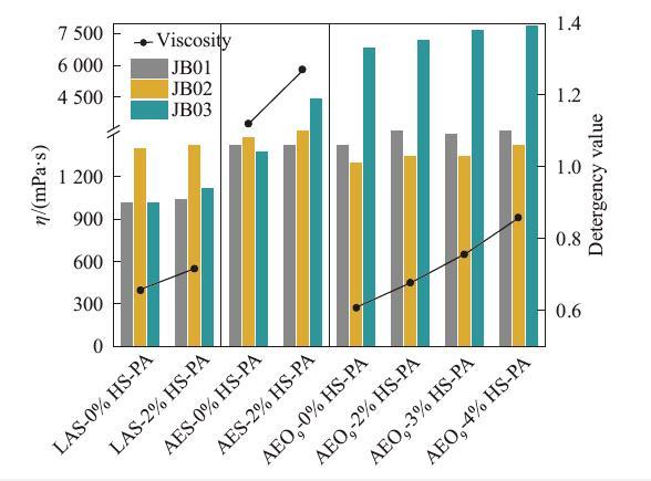 HS-PA作為高分子表面活性劑,不僅具有高分子的增稠性能,還有一定表面活性。為確保與空白組的總表面活性劑質(zhì)量分數(shù)一致,在加入HS-PA的同時,其他表面活性劑的添加量將相應(yīng)地減少(具體如表1所示)。表1中不同配方洗滌劑的去污力如圖4中的柱狀圖所示,不論有無HS-PA,不同表面活性劑體系的去污力有顯著區(qū)別:LAS為主表面活性劑的體系整體去污力最差,JB01炭黑和JB03皮脂污布的去污力未達到標準洗滌劑;其次為AES體系,在3種污布上的去污力均超過標準洗滌劑;AEO9的JB01和JB02去污力與AES體系接近,但它的皮脂去污力優(yōu)于AES體系。當(dāng)在不同體系的洗滌劑中復(fù)配HS-PA后,配方的JB01和JB02去污力無明顯變化,但JB03的去污效果均有提高,說明了HS-PA有利于提高在皮脂污布上的去污力。這可能是由于高分子表面活性劑通常具有良好的乳化性能,其疏水鏈可深入疏水粒子,親水鏈進入水溶液中,而它的高分子量具有較大空間位阻效應(yīng),使得分散狀態(tài)下的疏水粒子無法緊密相連,達到穩(wěn)定乳化的效果。皮脂作為油溶性污漬,經(jīng)過乳化后更易于被去除。從以上結(jié)果可知,在不同配方中加入HS-PA高分子表面活性劑不僅可以提高黏度,甚至還能提升在JB03上的去污力。