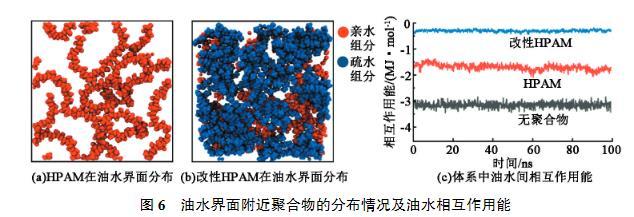 為更好地量化這一過程,計算了3個體系中油水之間的相互作用能,結果見圖6(c)。油水間相互作用能可以用來說明油水相的接觸面積,相互作用越強表面兩相的接觸面積越大。從圖6(c)看出,加入HPAM后相互作用有一定程度的減弱,說明油水相的接觸面積有所減小,因此會使界面張力出現一定程度的下降。改性HPAM加入后,油水相作用強度大幅減小,意味著油水相被改性HPAM有效隔離,可以有效降低界面張力。