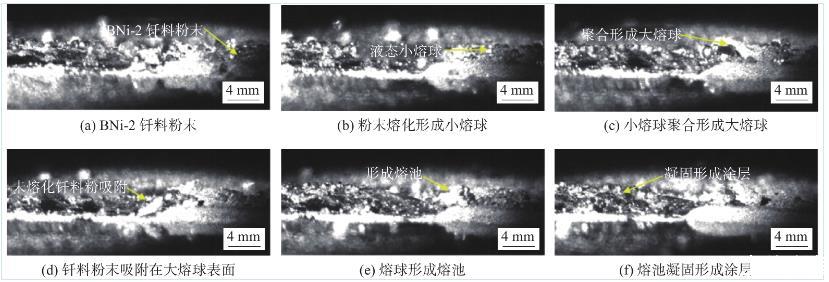 圖3是激光釬涂過程中的超高速攝影照片(4000幅/s),直觀地表征了激光釬涂過程中釬料粉末在激光作用下熔化、鋪展、凝固的過程。從圖3中可看出,在激光釬涂過程中,釬料呈現(xiàn)4種狀態(tài),分別為粉末態(tài)、熔球態(tài)、熔池態(tài)、凝固態(tài)。在激光未掃描的位置,釬料保持原始的粉末狀態(tài),如圖3a所示。被激光束掃到的位置,粉末態(tài)的釬料吸收能量,升溫熔化,形成尺寸較小的液態(tài)熔球,如圖3b所示。隨后,粉末釬料的不斷熔化形成更多液態(tài)小熔球,尺寸較小的熔球互相結(jié)合匯聚成尺寸較大的液態(tài)熔球,如圖3c所示。同時可觀察到未熔化的釬料粉末在液/固界面張力作用下,逐漸被吸附到尺寸較大的熔球表面,如圖3d所示。隨著激光逐漸向前掃描,熔球不斷長大,當(dāng)熔球固相表面張力與重力的合力作用大于液/固界面張力后,大尺寸熔球在基體鋪展?jié)櫇?,形成熔池,如圖3e所示。最后,隨著激光熱源的移動,激光后端的熔池溫度逐漸降低,液態(tài)釬料逐漸凝固,在基體表面形成涂層,如圖3f所示。