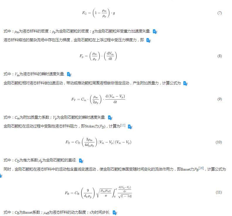 對于液態(tài)釬料熔池中存在復(fù)雜流場,金剛石顆粒上浮過程中存在重力和浮力的共同作用,計算公式為