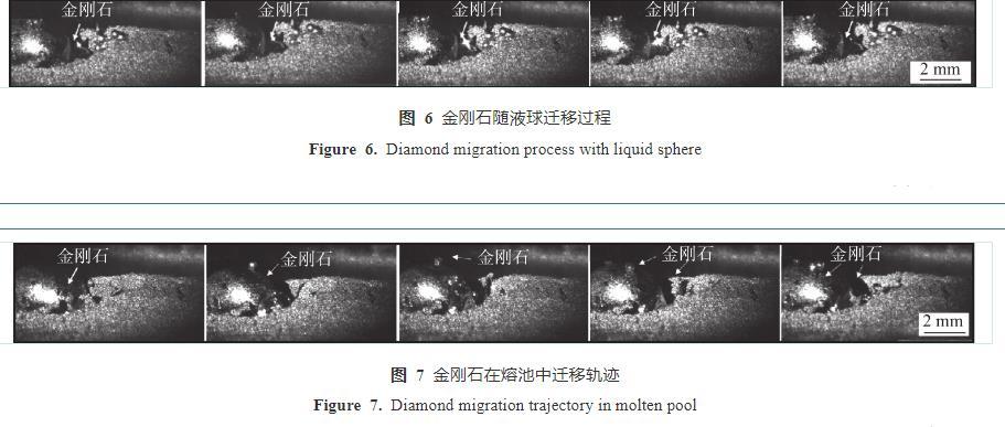 圖6所示為金剛石在液態(tài)球上的運動軌跡。隨著激光熱作用,釬料首先熔化成小液滴,然后匯聚成小球,由圖6可以看出,金剛石在液態(tài)小球上不穩(wěn)定的運動,以致可以見到金剛石表面亮度很高的閃光,這是金剛石反射的激光。圖7是激光釬涂過程中,金剛石在釬涂熔池中的運動路徑。金剛石顆粒首先存在于熔池邊緣底部,隨著釬涂過程的進(jìn)行,金剛石顆粒沿熔體球面逐漸向上部運動,然后在熔池表面向后方移動,當(dāng)激光熱源遠(yuǎn)離,熔池開始凝固,金剛石顆粒被固結(jié)于涂層近表面位置,保持一定的出刃高度,有利于發(fā)揮耐磨作用。金剛石運動總趨勢是沿液態(tài)球表面或熔池邊緣向液/氣界面遷移。