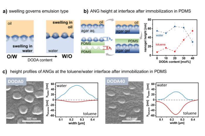 圖4的主要內容是關于納米凝膠在甲苯/水界面的膨脹、位置和變形。作者通過實驗研究了不同親水性納米凝膠在甲苯/水界面上的行為。實驗使用了不同親水性的納米凝膠(DODA0-DODA40),通過在凝膠陷阱技術中固定納米凝膠在油/水界面上,然后通過原子力顯微鏡(AFM)測量納米凝膠在水和甲苯中的突出高度。結果表明,親水性較強的DODA0納米凝膠在水中突出較高,而在甲苯中突出較低;而親水性較弱的DODA40納米凝膠在水中突出較低,而在甲苯中突出較高。這些結果表明,納米凝膠的親水性會影響其在油/水界面的位置和膨脹行為,從而影響其乳化能力。親水性較強的納米凝膠更傾向于與水相相互作用,而親水性較弱的納米凝膠更傾向于與油相相互作用。