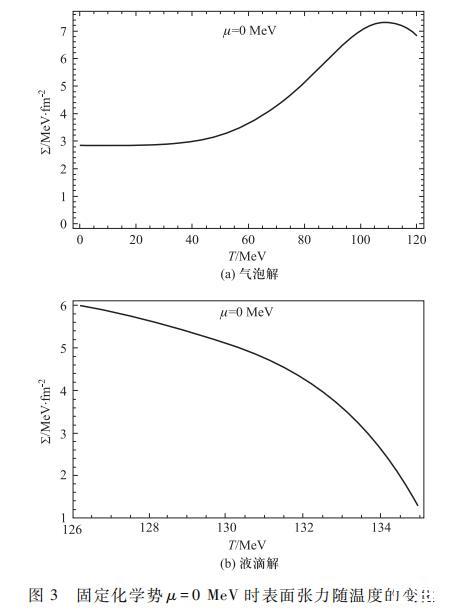 對于液滴解,ΔFb/T的值在靠近臨界溫度時也是迅速增加,而當溫度遠離臨界溫度時逐漸減小。造成這兩者變化的主要不同在于亞穩態是否會消失,對于氣泡解從圖1有效勢的變化可以看出即使到零溫,亞穩態仍然不會消失,所以ΔFb/T的值會在接近零溫時快速變大并趨于發散,但是從描述相變的角度來看遠離臨界溫度的氣泡解已經不再具有真實的物理意義。這與以往文獻中對于此模型研究的數值結果是一致的。而對于液滴解情形有效勢亞穩態會在溫度升高到Tsp=142.8 MeV時消失,Tsp這個溫度稱為亞穩態分解(Spinodal)溫度,此時液滴解不再存在,ΔFb/T的值變為0.