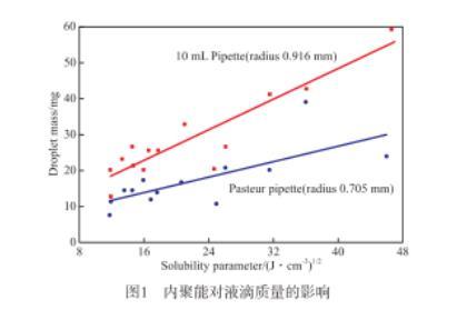 對(duì)于純物質(zhì)的溶解度參數(shù)可通過(guò)文獻(xiàn)查閱、基團(tuán)貢獻(xiàn)計(jì)算法和液體熱力學(xué)關(guān)系式計(jì)算。而礦物油為混合物,很難查到或者估算它的溶解度參數(shù)。文獻(xiàn)提供了一種溶解度參數(shù)的估算法:稱量10~20滴液體,然后計(jì)算每滴液體的平均質(zhì)量;另取2種已知溶解度參數(shù)的非揮發(fā)性液體作為參照,通過(guò)做圖大致計(jì)算出液體的溶解度參數(shù)。實(shí)驗(yàn)需保持恒溫。分別通過(guò)內(nèi)徑為0.916 mm的10 mL移液管和內(nèi)徑為0.705 mm的巴斯德移液管移取液滴,得到兩條溶解度參數(shù)與液滴質(zhì)量的關(guān)系曲線。內(nèi)聚能對(duì)液滴質(zhì)量的影響見(jiàn)圖1。由圖1可見(jiàn),液滴的質(zhì)量與液體溶解度參數(shù)成線性關(guān)系。該估算方法可用來(lái)計(jì)算混合液體的溶解度參數(shù),適用于礦物潤(rùn)滑油溶解度參數(shù)的計(jì)算。雖然估算方法過(guò)于粗糙,但為估算礦物油等復(fù)雜混合物的溶解度參數(shù)提供了思路。文獻(xiàn)介紹了液滴的大小與液體表面張力有關(guān)。由此可見(jiàn),溶解度參數(shù)與表面張力存在一定的關(guān)系。