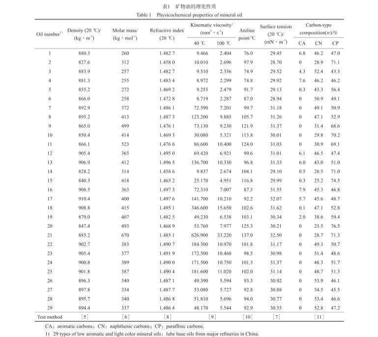 29種常見(jiàn)的低芳淺色礦物油:取自國(guó)內(nèi)主要煉油廠的潤(rùn)滑油基礎(chǔ)油,包括主要的石蠟基基礎(chǔ)油和環(huán)烷基基礎(chǔ)油,不包括深色高芳烴礦物油;從精制程度看,包括高壓加氫深度精制油品,也包括溶劑精制和白土精制工藝精制油品;從碳型結(jié)構(gòu)看,包括芳環(huán)碳(CA)含量為零的油品,也包括CA含量小于10%(w)的油品。礦物油的理化性質(zhì)見(jiàn)表1。