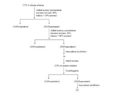 1.2.1瀝青質及其亞組分的分離利用正己烷沉淀出原油中的瀝青質A.利用混合溶劑(甲苯和丙酮)沉淀法,將A分為4個不同的亞組分,分離流程如Scheme 1所示。首先,制備質量分數為2.5%的A甲苯溶液,作為初始瀝青質溶液,然后加入丙酮,將該混合物(甲苯/瀝青質/丙酮)靜置20 h后,以3500 r/min的轉速離心40 min,分別收集瀝青質的第1個亞組分A1和上清液AS1.在AS1中繼續加入丙酮至濃度為80%,離心沉淀,分別收集瀝青質的第2個亞組分A2和上清液AS2.通過常壓蒸餾去除AS2中的溶劑,得到瀝青質的中間亞組分Ai.將Ai以質量分數為2.5%的濃度溶于丙酮,靜置20 h后,離心40 min得到瀝青質的第3個亞組分A3和上清液AS3,然后通過常壓蒸餾去除AS3中的溶劑得到瀝青質的第4個亞組分A4.
