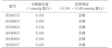取每1 g蛋白質中含0.130 mmol、0.160 mmol、0.190 mmol辛酸鈉的加標回收率溶液作為供試品,每個濃度分別制備3份進行測定,根據標準曲線計算辛酸鈉含量。