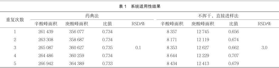 辛酸峰與庚酸峰的分離度應大于1.5,辛酸峰的拖尾因子應為0.95~1.20,辛酸對照品溶液連續進樣5次,所得辛酸峰與庚酸峰面積之比的相對標準偏差應不大于5%。