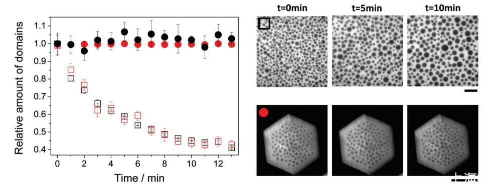 圖 5 帶電(圓形)和中性(方形)雙層(紅色)或單層(黑色)的域相對數量與時間的關系。 這些圖像是一個例子 中性單層(上)和帶電(下)雙層在指定時間。 圖像中包含的符號對應于圖像中的相同符號 形象的。 比例尺對應于 50 毫米。