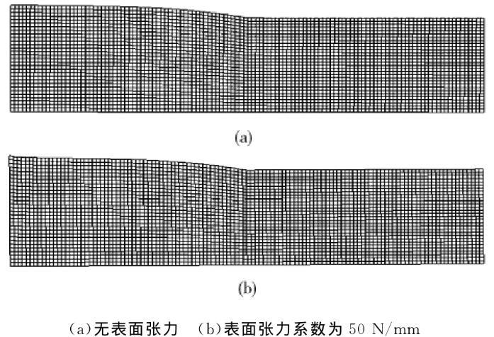AE=1.2mm時,表面張力系數(shù)為零和表面張力系數(shù)為50N/mm時的網格變形如圖4所示。從圖4可以看出,有表面張力和沒有表面張力的時候,網格的變形并沒有太大的區(qū)別,只是網格的變形量略微有些不同。說明有表面張力的時候,自由表面的形變方式并沒有很大的變化。但在自由表面出口處的變形非常明顯。這說明表面張力對微擠出自由表面出口處的流場影響很大。這是因為自由表面出口處的邊界條件突然變化,從而導致表面張力在此處的作用效果有較大變化。