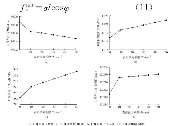 (2)在微擠出中,表面張力系數(shù)越大,擠出脹大越明顯,擠出口模內熔體的進出口壓強都明顯增大,口模內熔體的壓力降略微減小,平均出口速度略微增大,自由表面出口壓力與平均出口速度都明顯減小;