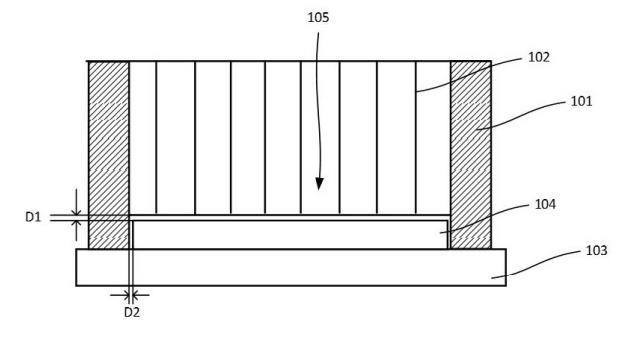 如圖1所示,在一個實施例中,所述筒壁101的材質(zhì)可以為聚合物、陶瓷、金屬等耐腐蝕的材料,所述筒壁101的形狀例如可以為圓柱狀,所述筒壁101的徑向?qū)挾却笥谒鼍A104的徑向?qū)挾龋鐾脖?01套設(shè)于晶圓104外圍時,所述筒壁101與所述晶圓104邊緣之間的間距D2為30微米~500微米,如100微米、200微米、300微米等,以避免套設(shè)時碰撞晶圓104而造成晶圓104或筒壁101的損傷。
