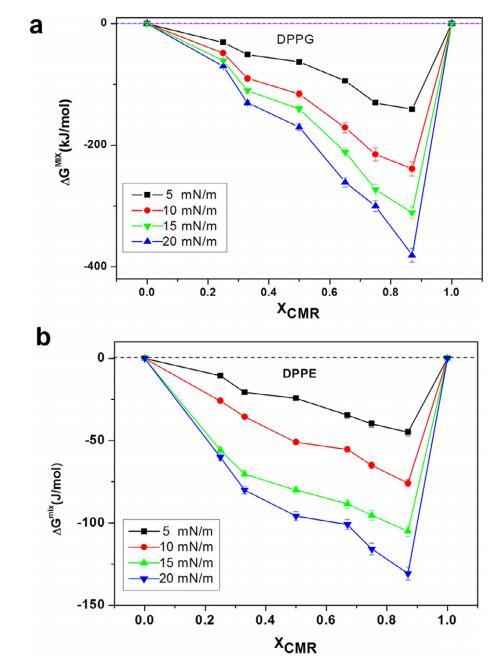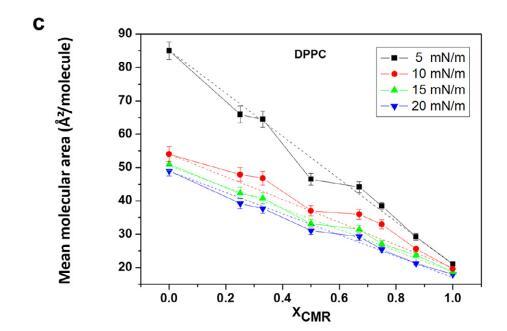 純和混合單層的 pA 等溫線與分子面積的關系如圖 1 所示。CMR/DPPG 等溫線顯示出與純 DPPG 脂質相似的趨勢(圖 1a)。 相似相 對所有 CMR/DPPG 混合物都觀察到了轉變。 DPPG 和 DPPC 顯示崩潰壓力 (DPcoll) 為 52 mN.m-1 次方和 60 mN.m-1次方 , 分別。 一個過渡 (p ffi 3 mN.m-1次方 ) 從液體 發現純 DPPE 單層膨脹為凝聚相 與 D. coll 在 ffi55 mN.m-1次方 . 為 D. coll 獲得的值 純脂質與文獻一致(Vollhardt 等人, 2000; 諾沃塔斯卡等人,2014 年)。