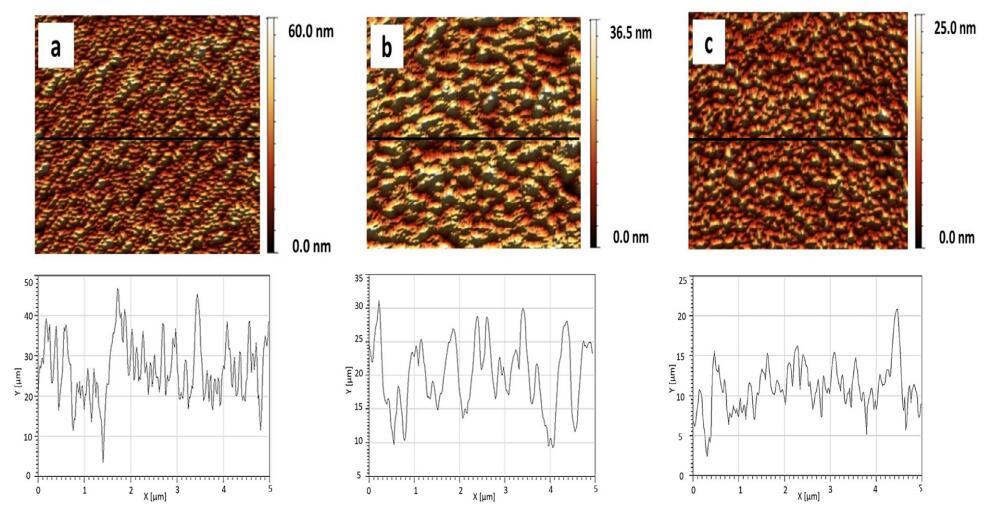 圖 9 顯示了純磷脂單層的 AFM 圖像 在 p = 20 mN/m 時轉移。 純磷脂顯示出均勻的 均方根 (rms) 等于 0.219 nm 的圖案, DPPG、DPPE 和 DPPC 分別為 0.060 nm 和 0.054 nm (圖 9)。 我們獲得了 rms ~ 0.045 nm (XCMR = 0.87) 相當于 光滑的單層形貌(圖 10a)。 另一方面, CMR/DPPE 和 CMR/DPPC 薄膜對應于粗糙表面 rms 分別為 0.1754 nm 和 0.072 nm(圖 10b 和 c)。 測量重復三次,rms 的標準偏差約為 5%。