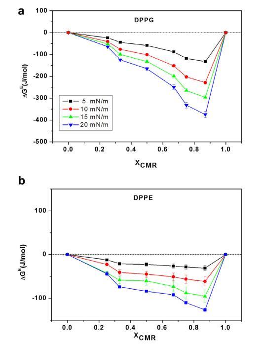CMR/DPPG 混合膜的 ?Ge 和 ?Gmix 表示負 從 XCMR ≥ 0.25 到 XCMR = 1.0 的偏差(圖 7a 和 8a)。 ?Ge 和 ?Gmix 負值表明 CMR/DPPE 單層是 熱力學穩定(圖 7b)。 ?Ge 和 ?Gmix 值為 DPPC 混合單層陽性,表明不混溶 (圖 7c 和 8c)。 分子之間的距離取決于 在導致排斥的磷脂頭部基團上 互動(邁爾斯,1999 年;博格斯,1987 年)。