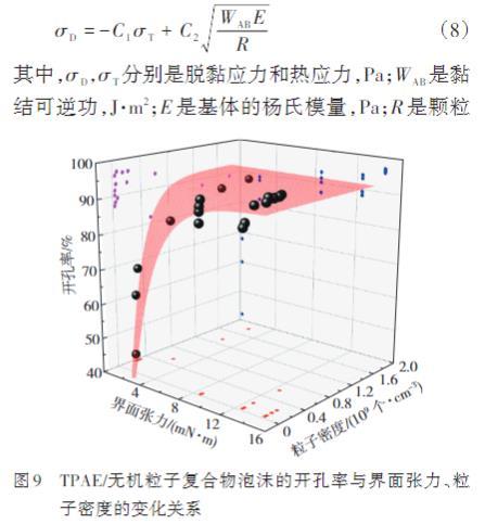 無機粒子與TPAE具有較高界面張力,并且粒子在TPAE基體中的分布密度較大時,復合物傾向于形成具有更高開孔率的泡沫。其中對于TPAE/CaSiO3復合物,CaSiO3的團聚現象導致的粒子尺寸增加也對泡沫的開孔率產生改善效果。此現象的理論依據可追溯至Vollenberg和Heikkinen提出的關于脫黏所需起始應力的公式(8)