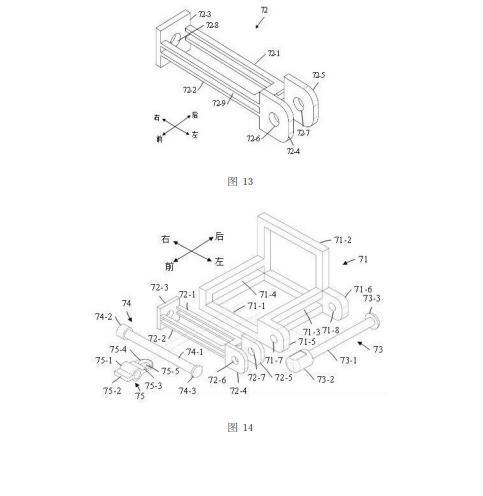 如圖13所示,滑動座72包括第一U形板72-1、第二U形板72-2、蓋形板72-3、第一尾板72-4、以及第二尾板72-5。第一U形板72-1和第二U形板72-2的開口端都與蓋形板72-3的左側(cè)面(即里側(cè)面)固定連接,并且第一U形板72-1和第二U形板72-2均與蓋形板72-3相垂直,其中蓋形板72-3沿豎直方向延伸且蓋形板72-3上設(shè)置有通孔72-8,第一U形板72-1和第二U形板72-2均沿水平方向延伸;第一U形板72-1位于第二U形板72-2的上方,第一U形板72-1與第二U形板72-2相互平行且二者之間設(shè)置有一個縫隙72-9。在本實(shí)施例中,第一U形板72-1與第二U形板72-2相同。