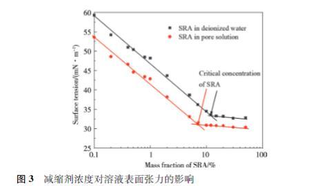 由圖3還可知,SRA在去離子水中混合時(shí),臨界SRA濃度約為11.2%,當(dāng)SRA在合成孔溶液中混合時(shí),臨界SRA濃度約為7.3%.這意味著溶液中的離子會使得臨界SRA濃度降低。對于混凝土,實(shí)際的內(nèi)部離子濃度更高,而臨界SRA濃度取決于孔隙溶液的離子組成,因此,實(shí)際的臨界SRA濃度更低。