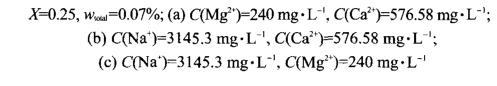 配制溶液所用的是高礦化度且含有高濃度二價金屬離子的模擬礦化水,從上面的實驗結果中看出,HDAPS/SDS混合體系在高鹽條件下可以與原油達到超低界面張力。考慮到在實際應用過程中地層水的礦化度可能發生變化,恒定模擬水中Na+、Mg2+和Ca2+中兩種金屬離子的濃度,考察了Na+、Mg2+和Ca2+濃度變化對HDAPS/SDS混合體系與原油界面張力的影響,實驗結果如圖3所示。從圖中可以看出,模擬水中Na+濃度在1500-4500 mg·L-1、Mg2+濃度在120-360 mg·L-1和Ca2+濃度在200-800 mg·L-1范圍內變化時,HDAPS/SDS混合體系與原油的界面張力均可達到超低界面張力,這說明在高礦化度和高濃度二價金屬離子條件下,HDAPS/SDS混合體系也表現出非常優異的界面活性。
