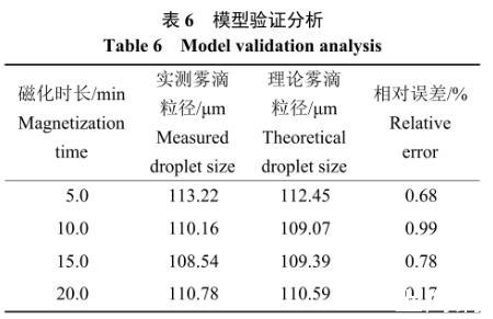 為驗證350 mT磁場強度時霧滴粒徑調控模型的實際應用價值,參考磁化除草劑溶液霧滴粒徑的試驗設計,在磁場強度為350 mT前提下,對除草劑溶液分別循環磁化5.0、10.0、15.0、20.0 min,實測霧滴粒徑與模型理論霧滴粒徑見表6,經過分析,實測值與理論值相對誤差均小于1%,此模型具有實際應用價值。