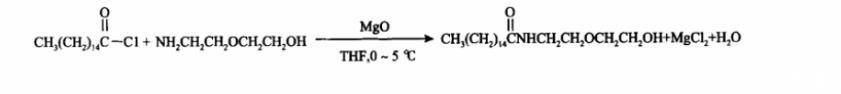 1.2.1棕櫚酸二甘醇酰胺的合成稱取9.10 g二甘醇胺,放入裝有攪拌器、溫度計和恒壓漏斗的500 mL三口燒瓶中,并加入約70 mL水。通過冰浴將溫度控制在0~5℃范圍內,加入溶劑210 mL(V(水)∶V(四氫呋喃)=1∶3)及氧化鎂16.80 g(n(氧化鎂)∶n(二甘醇胺)=5∶1)。攪拌約30 min后,稱取22.88 g棕櫚酰氯溶解于70 mL四氫呋喃,轉移到恒壓漏斗中,緩慢滴加到三口瓶中,滴加時間為0.5 h左右,在0~5℃下攪拌反應2~2.5 h。反應物物質的量比為n(棕櫚酰氯)∶n(二甘醇胺)=1∶1.02。反應結束后將反應混合物倒入布氏漏斗中抽濾,除去過量的氧化鎂和生成的氯化鎂,收集濾液,旋蒸除去溶劑,最后于55℃下真空干燥12 h,得到目標產物,外觀為白色粉末。
