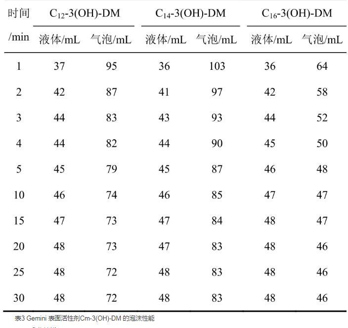 表3 Gemini表面活性劑Cm-3(OH)-DM的泡沫性能
