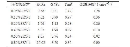 測(cè)試表明:隨SRY-1濃度的增加,壓裂液彈性模量G′不斷增大,Tanδ不斷減小,并且SRY-1超過(guò)CAC1(0.18%)后,增大和減小的趨勢(shì)更明顯。從壓裂液微觀作用機(jī)理分析,優(yōu)良的黏彈特性建立在CAC之上,依靠分子鏈間多重共價(jià)鍵交聯(lián)作用來(lái)形成高強(qiáng)度空間網(wǎng)絡(luò)結(jié)構(gòu),才能在壓裂液懸浮、攜帶支撐劑能力上發(fā)揮獨(dú)特優(yōu)勢(shì)。為此,進(jìn)一步測(cè)試了40/70支撐劑在壓裂液中的沉降速度,結(jié)合壓裂液G′、G″、Tanδ與沉降速度進(jìn)行關(guān)聯(lián)分析,如表5所示。