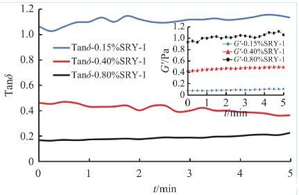 黏彈性是指流體對(duì)施加外力的響應(yīng),表現(xiàn)為黏性和彈性雙重特性,通常用G′表征彈性模量,G″表征黏性模量,而G″與G′的比值記作Tanδ,用于表征流體黏彈性的強(qiáng)弱:隨Tanδ由大到小變化,流體黏彈特性越明顯,Tanδ>1時(shí),流體流動(dòng)性強(qiáng),Tanδ<1時(shí),流體結(jié)構(gòu)性強(qiáng)。對(duì)0.15%、0.4%、0.8%SRY-1的壓裂液進(jìn)行了黏彈性測(cè)試(利用RS6000流變儀錐板測(cè)試系統(tǒng)進(jìn)行定頻率定應(yīng)力掃描實(shí)驗(yàn),測(cè)試得到的彈性模量G′、Tanδ變化情況見圖6所示。