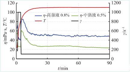圖5不同配方壓裂液耐溫耐剪切測(cè)試曲線(110℃)