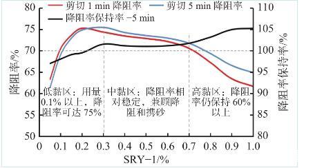 分別測(cè)試了不同SRY-1濃度下剪切1 min和循環(huán)剪切5 min后的降阻率,結(jié)果如圖4所示,從曲線可以看出,壓裂液降阻率最高可達(dá)75%以上,即使是高黏液降阻率也保持在60%以上;隨SRY-1濃度的增加呈先快速增加,再緩慢下降,再到較快下降的3個(gè)階段:當(dāng)SRY-1濃度低于CAC1(0.18%)時(shí),隨濃度的增加,壓裂液由分子內(nèi)多重共價(jià)鍵作用逐步向分子間共價(jià)鍵物理交聯(lián)轉(zhuǎn)變,并在剪切作用下增加分子間接觸機(jī)會(huì),促進(jìn)空間網(wǎng)絡(luò)結(jié)構(gòu)形成,吸收部分湍流渦流能量,顯著減小湍流能量耗散,從而表現(xiàn)出降阻率快速增加的趨勢(shì);當(dāng)SRY-1濃度在CAC2(0.4%)附近時(shí),壓裂液空間網(wǎng)絡(luò)結(jié)構(gòu)在剪切作用下逐漸形成并加強(qiáng),彈性增加,吸收并儲(chǔ)存湍流能量的能力加強(qiáng),所以即使在壓裂液黏度增加較快的情況下,壓裂液降阻率保持相對(duì)穩(wěn)定,在現(xiàn)場(chǎng)施工中,隨排量的增大,湍流現(xiàn)象更加嚴(yán)重,結(jié)構(gòu)流體儲(chǔ)存并轉(zhuǎn)換能量的作用更明顯,降阻性能會(huì)比室內(nèi)測(cè)試更突出;當(dāng)SRY-1濃度繼續(xù)增大,壓裂液黏性急劇增加,流動(dòng)的能量損耗也隨之顯著增大,從而導(dǎo)致降阻率下降較快。