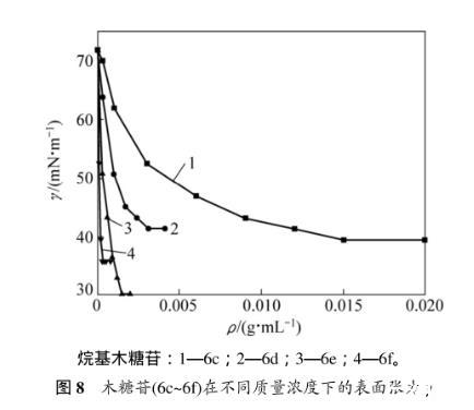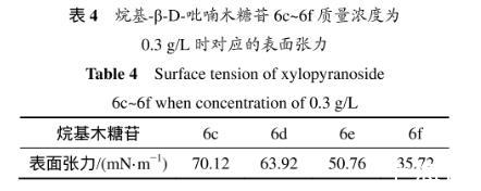 表3所示為烷基-β-D-吡喃木糖苷6c~6f的臨界質(zhì)量分?jǐn)?shù)及所對應(yīng)的表面張力。溶液表面的吸附量達到飽和時(剛好飽和時的濃度即為臨界濃度),表面張力最小。從表3可以看出:辛基-β-D-吡喃木糖苷(6e)達到臨界濃度時對應(yīng)的表面張力是最低的,能力最強。因為烷基木糖苷的表面活性是由其親水糖基和疏水烷基鏈共同決定,當(dāng)烷基鏈長為=8(糖苷6e)時,親水性和疏水性達到最佳平衡,表面張力最低。