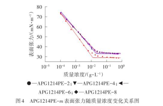 平衡表面張力揭示了表面活性劑降低溶劑(通常是水)表面張力的能力。表面活性劑的許多應用都與平衡表面張力有關,例如起泡作用、潤濕作用、鋪展作用等。圖2為APG0810PE-n和APG0810平衡表面張力隨著質量濃度變化的關系圖,圖3、圖4為APG1214PE-m和APG1214平衡表面張力隨著質量濃度變化的關系圖,相應的物化性能參數列于表3。