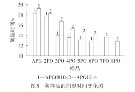 泡沫是氣體在液體中的分散體系,氣體成為氣泡被連續相的液體分隔開,氣體是分散相,液體是分散介質。在大規模的洗滌和印染工業中,泡沫給操作帶來不便,因此新型的低泡表面活性劑越來越受關注。由表4可以看出,PO基團引入APG中明顯地降低了泡沫的形成和穩定性,而且在相同PO加合數下,APG0810變化更明顯,因此制備的系列樣品屬于低泡表面活性劑。