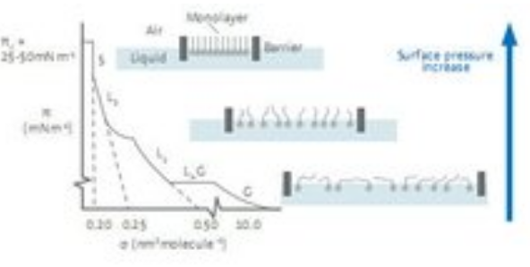 在進行典型的等溫壓縮測試時,單分子層先從二維的氣相(G)轉變到液相(L)最后形成有序的固相(S)。在氣相中,分子間的相互作用力比較弱;當表面積減小,分子間的堆積更為緊密,并開始發生相互作用;在固相時,分子的堆積是有序的,導致表面壓迅速增大。當表面壓達到最大值即塌縮點后,單分子層的堆積不再可控(圖1)。