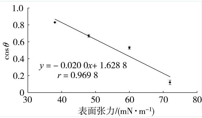葉片臨界表面張力直接影響藥液在葉片表面的沉積特性,臨界表面張力越小越不利于藥液霧滴的沉積、潤濕和展布。測試液的表面張力與cosθ間呈顯著負(fù)相關(guān)關(guān)系(圖3),其擬合方程為y=0.020 0x+1.628 8(r=0.969 8),其中x為表面張力,y為cosθ。根據(jù)擬合方程計(jì)算得到煙草葉片的臨界表面張力為31.44 mN/m。與王亞虹等和陳海濤等測定的K326和云87兩個(gè)煙草品種相近,表明不同煙草品種葉片臨界表面張力值差異不大,且明顯低于小麥、棉花和茄子等,說明普通農(nóng)藥霧滴不容易在煙草葉片表面潤濕和展布,因此需要合理使用助劑降低農(nóng)藥藥液的表面張力至低于煙草葉片臨界表面張力。