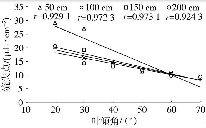 流失點(diǎn)是農(nóng)藥噴施量的關(guān)鍵決定參數(shù),當(dāng)農(nóng)藥噴施量超過流失點(diǎn),會(huì)減少藥液在葉片表面的持留量,降低藥效且造成農(nóng)藥的浪費(fèi)。圖4表明,流失點(diǎn)與葉傾角呈顯著負(fù)相關(guān),且隨著噴霧距離增加,斜率降低,說明葉傾角和噴霧距離對流失點(diǎn)均有顯著影響。