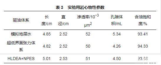 通過(guò)巖心動(dòng)態(tài)驅(qū)替實(shí)驗(yàn)評(píng)價(jià)體系提高采收率的能力,實(shí)驗(yàn)裝置見圖1。采用不間斷驅(qū)油的方式,以0.3 mL/min的注入流量驅(qū)油。分別考查模擬地層水、HLDEA+NPES體系和超低界面張力體系的驅(qū)油性能。實(shí)驗(yàn)用巖心物性參數(shù)見表3。實(shí)驗(yàn)的具體步驟如下。