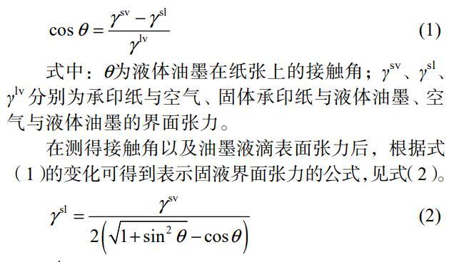 式中:θ為液體油墨在紙張上的接觸角;γsv、γsl、γlv分別為承印紙與空氣、固體承印紙與液體油墨、空氣與液體油墨的界面張力。在測得接觸角以及油墨液滴表面張力后,根據式(1)的變化可得到表示固液界面張力的公式,見式(2)。