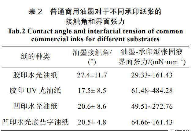 表2普通商用油墨對于不同承印紙張的接觸角和界面張力