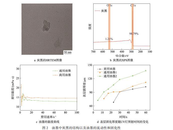 在制備油墨時,需關注黏度、分散穩定性和固化速度,確保噴碼順利。炭黑是關鍵組分,為避免炭黑團聚導致穩定性下降和打印堵塞,選擇粒徑適中的炭黑。粒徑過小易團聚,過大可能堵塞,所選炭黑粒徑在50 nm左右,HRTEM圖像如圖2a所示。對所選炭黑進行XPS分析,發現其氧含量高達1.2%,如圖2b所示。這一特性有望改善炭黑與油墨中極性液體的相互作用,從而進一步提升油墨的穩定性。炭黑的良好分散性不僅有助于提高油墨的穩定性,還有助于降低油墨的黏度。如圖2c所示,通用油墨的黏度降至13.0 mPa·s,相比商用油墨的15.5 mPa·s下降約17%,黏度的降低更有利于噴墨打印的流暢進行。